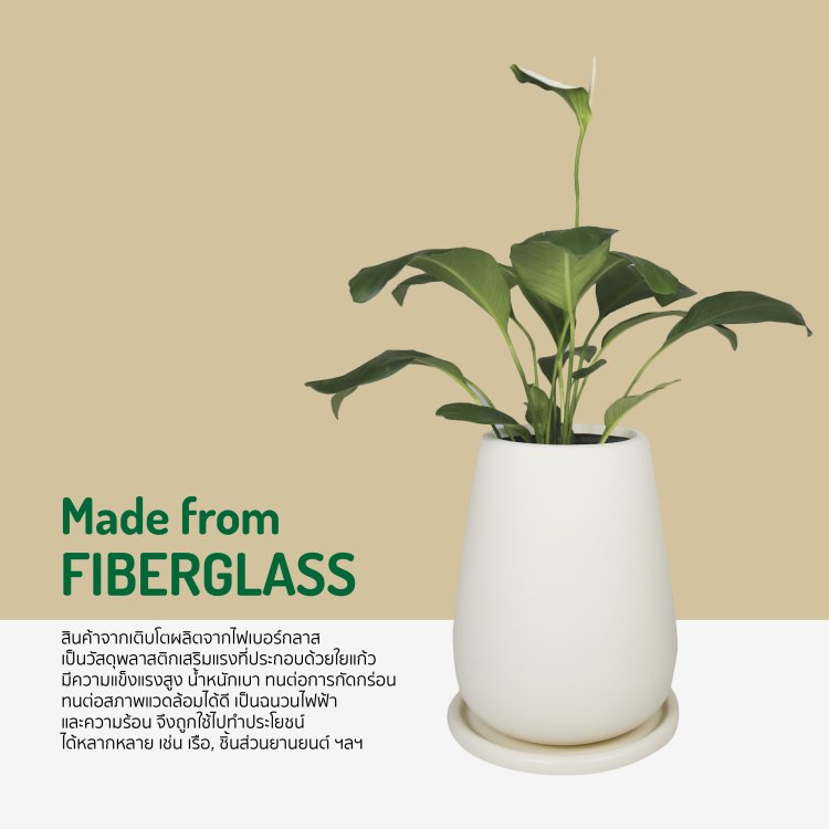 ไฟเบอร์กลาสเป็นวัสดุที่มาจากการสลายใยแก้วหรือใยไฟเบอร์กลาสที่ผ่านกระบวนการเสริมรักษาความแข็งแรงด้วยเรซิ่น (Resin) ซึ่งเป็นสารเคมีที่ทำให้ไฟเบอร์กลาสมีความแข็งแรง และทนทานต่อการใช้งานต่างๆ เช่น การเปียกน้ำ แสงแดด และอุณหภูมิสูงต่อได้ จึงทำให้กระถางต้นไม้ไฟเบอร์กลาสมีความหนาแน่นและความแข็งแรงสูงและน้ำหนักเบากว่ากระถางต้นไม้ที่ผลิตจากวัสดุอื่น ทำให้สามารถเคลื่อนย้ายและขนส่งได้ง่ายขึ้น และมีความทนทานต่อการเก็บรักษาเป็นเวลานาน นอกจากนี้ไฟเบอร์กลาสยังมีความทนทานต่อสารเคมี และการเปลี่ยนแปลงอุณหภูมิสูง ทำให้เหมาะสำหรับการปลูกต้นไม้ในสภาพแวดล้อมที่มีอุณหภูมิและความชื้นสูงได้ดี